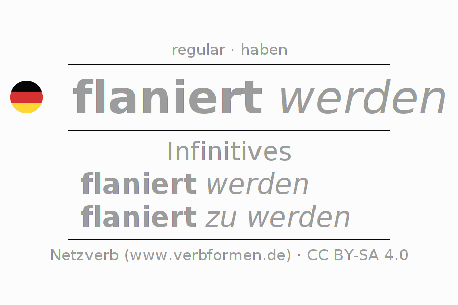 The conjugation of flanieren in Infinitive Present Perfect base form Passive is flaniert werden, flaniert zu werden.The conjugation corresponds to certain grammatical rules. Likewise the requirements for the conjugation of the simple verb forms of flanieren in Infinitive. Comments ☆