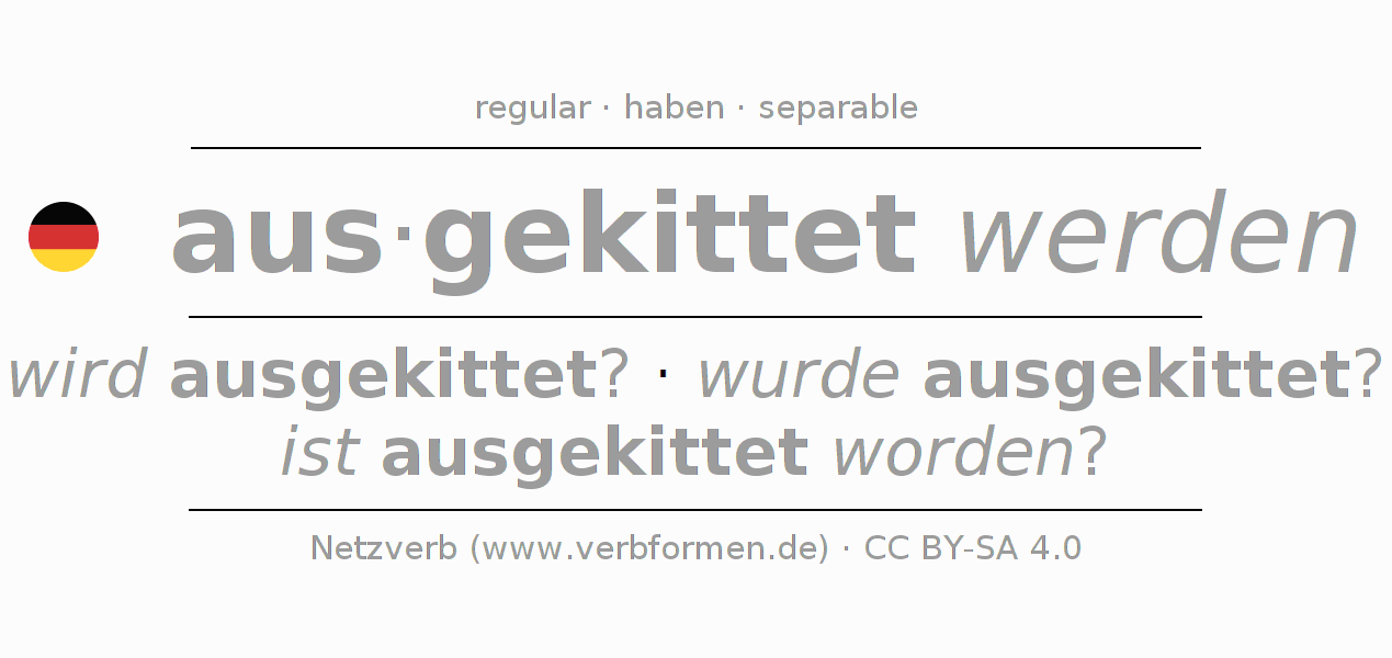 The conjugation of auskitten in Infinitive Present Perfect base form Passive is ausgekittet werden, ausgekittet zu werden.The conjugation corresponds to certain grammatical rules. Likewise the requirements for the conjugation of the simple verb forms of auskitten in Infinitive. Comments ☆