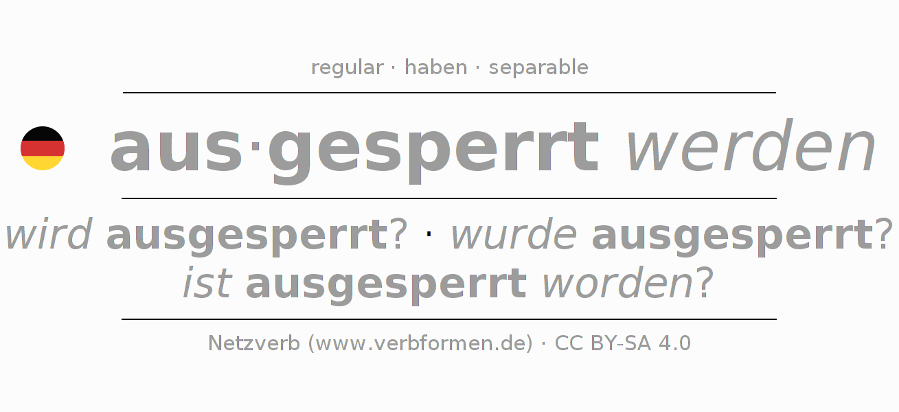 The conjugation of aussperren in Infinitive Present Perfect base form Passive is ausgesperrt werden, ausgesperrt zu werden.The conjugation corresponds to certain grammatical rules. Likewise the requirements for the conjugation of the simple verb forms of aussperren in Infinitive. Comments ☆