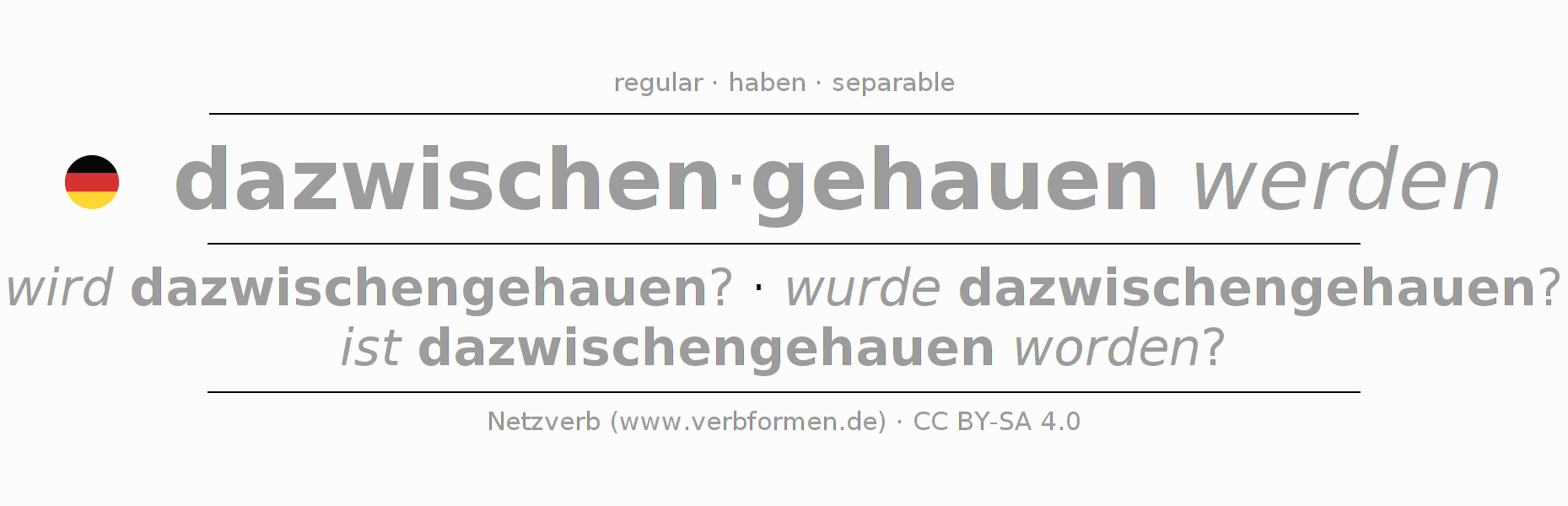 The verb dazwischenhauen (regelm) fully conjugated in all persons and numbers in the Infinitive Present Perfect