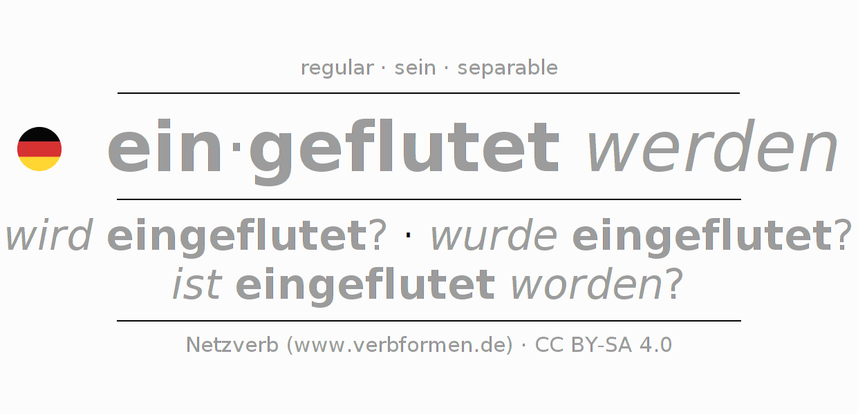 The conjugation of einfluten in Infinitive Present Perfect base form Passive is eingeflutet werden, eingeflutet zu werden.The conjugation corresponds to certain grammatical rules. Likewise the requirements for the conjugation of the simple verb forms of einfluten in Infinitive. Comments ☆
