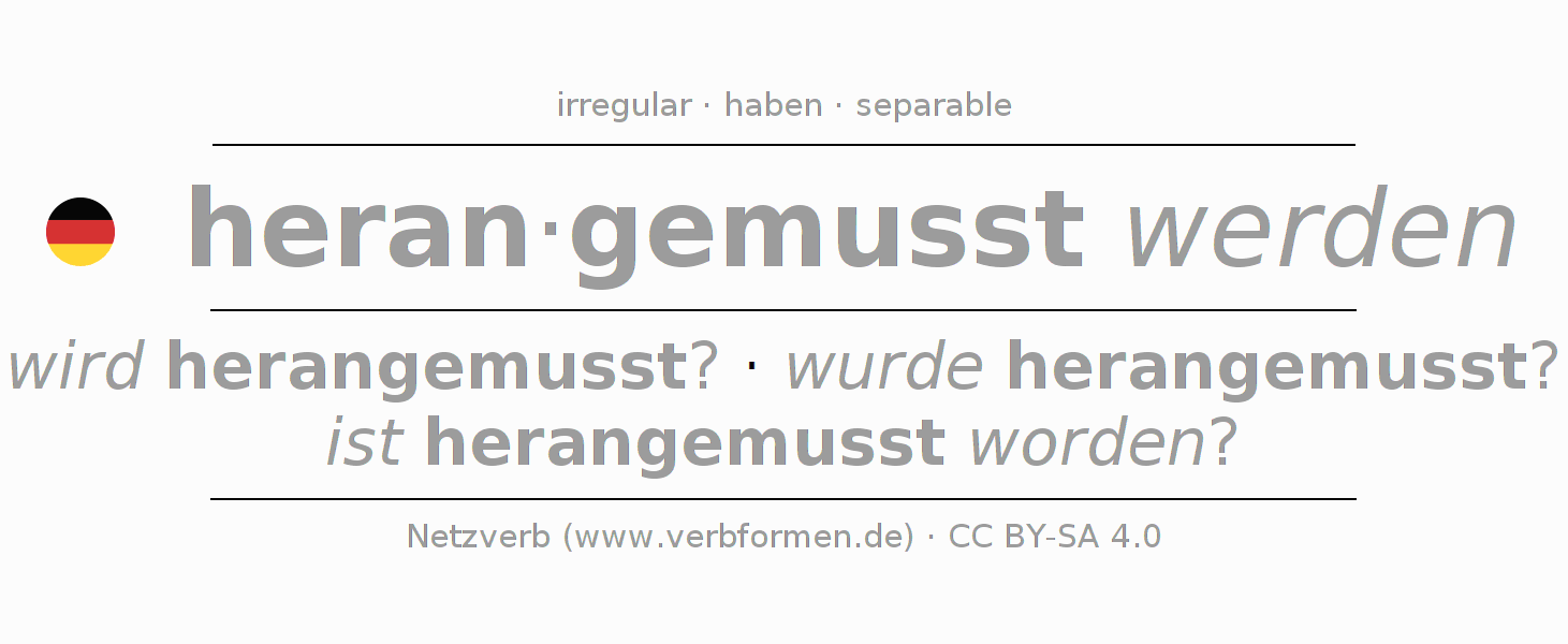 The conjugation of heranmüssen in Infinitive Present Perfect base form Passive is herangemusst werden, herangemusst zu werden.The conjugation corresponds to certain grammatical rules. Likewise the requirements for the conjugation of the simple verb forms of heranmüssen in Infinitive. Comments ☆