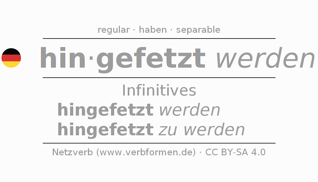 The conjugation of hinfetzen in Infinitive Present Perfect base form Passive is hingefetzt werden, hingefetzt zu werden.The conjugation corresponds to certain grammatical rules. Likewise the requirements for the conjugation of the simple verb forms of hinfetzen in Infinitive. Comments ☆