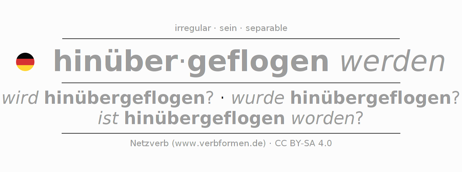 The conjugation of hinüberfliegen in Infinitive Present Perfect base form Passive is hinübergeflogen werden, hinübergeflogen zu werden.The conjugation corresponds to certain grammatical rules. Likewise the requirements for the conjugation of the simple verb forms of hinüberfliegen in Infinitive. Comments ☆