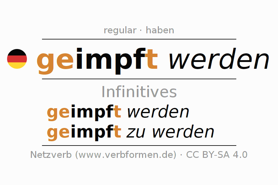 The conjugation of impfen in Infinitive Present Perfect base form Passive is geimpft werden, geimpft zu werden.The conjugation corresponds to certain grammatical rules. Likewise the requirements for the conjugation of the simple verb forms of impfen in Infinitive. Comments ☆