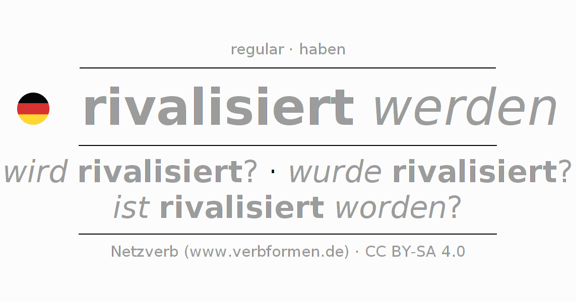The conjugation of rivalisieren in Infinitive Present Perfect base form Passive is rivalisiert werden, rivalisiert zu werden.The conjugation corresponds to certain grammatical rules. Likewise the requirements for the conjugation of the simple verb forms of rivalisieren in Infinitive. Comments ☆