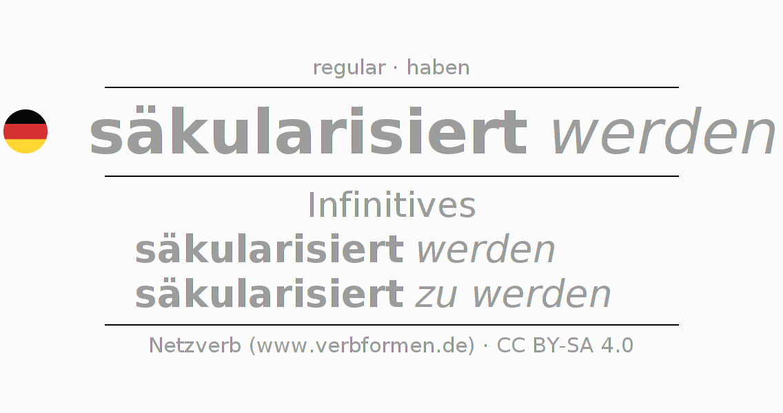 The verb säkularisieren fully conjugated in all persons and numbers in the Infinitive Present Perfect