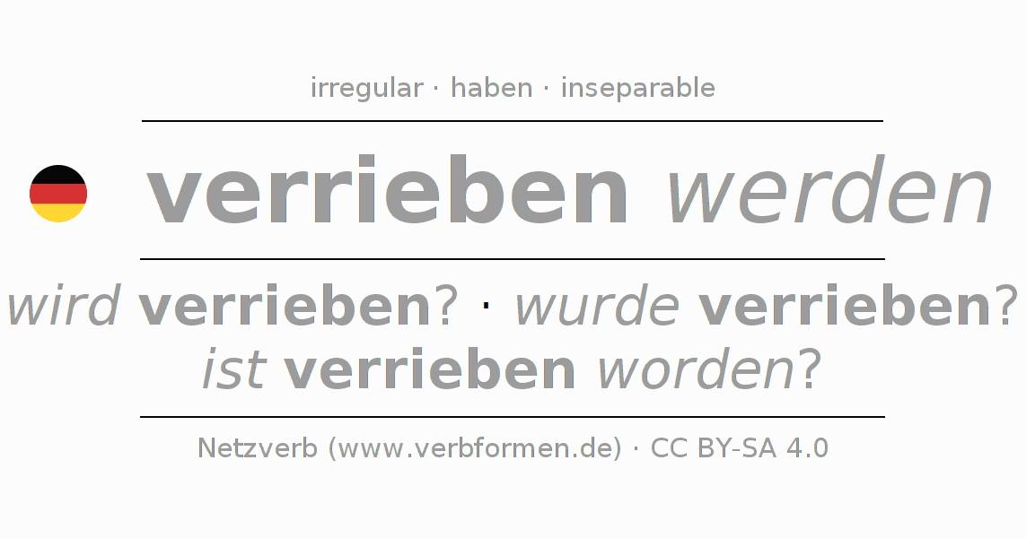 The conjugation of verreiben in Infinitive Present Perfect base form Passive is verrieben werden, verrieben zu werden.The conjugation corresponds to certain grammatical rules. Likewise the requirements for the conjugation of the simple verb forms of verreiben in Infinitive. Comments ☆