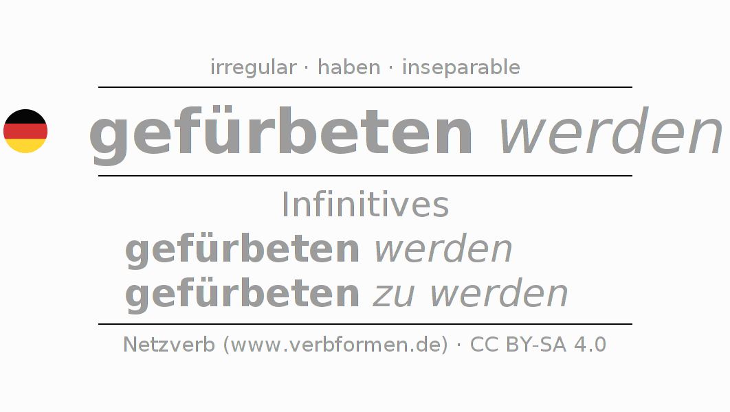 The conjugation of fürbitten in Infinitive Present Perfect base form Passive is gefürbeten werden, gefürbeten zu werden.The conjugation corresponds to certain grammatical rules. Likewise the requirements for the conjugation of the simple verb forms of fürbitten in Infinitive. Comments ☆