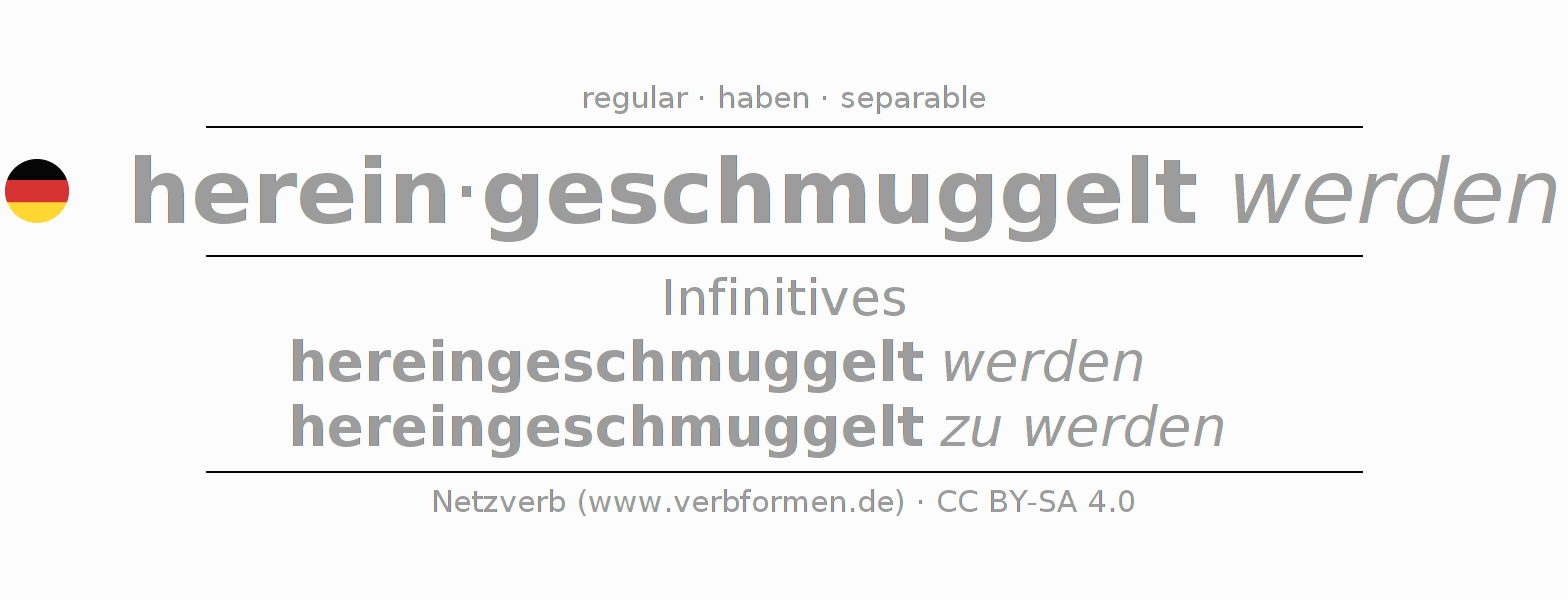 The conjugation of hereinschmuggeln in Infinitive Present Perfect base form Passive is hereingeschmuggelt werden, hereingeschmuggelt zu werden.The conjugation corresponds to certain grammatical rules. Likewise the requirements for the conjugation of the simple verb forms of hereinschmuggeln in Infinitive. Comments ☆