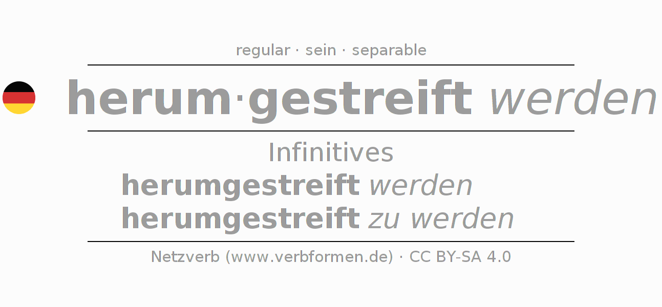 The conjugation of herumstreifen in Infinitive Present Perfect base form Passive is herumgestreift werden, herumgestreift zu werden.The conjugation corresponds to certain grammatical rules. Likewise the requirements for the conjugation of the simple verb forms of herumstreifen in Infinitive. Comments ☆
