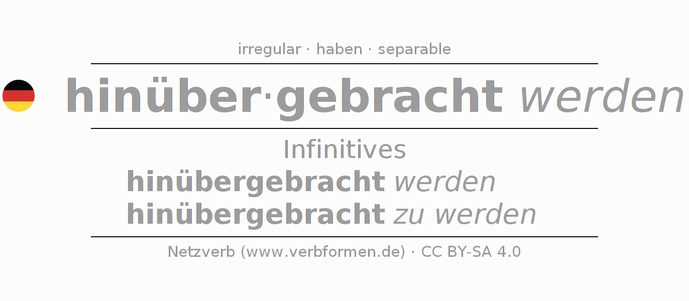 The conjugation of hinüberbringen in Infinitive Present Perfect base form Passive is hinübergebracht werden, hinübergebracht zu werden.The conjugation corresponds to certain grammatical rules. Likewise the requirements for the conjugation of the simple verb forms of hinüberbringen in Infinitive. Comments ☆