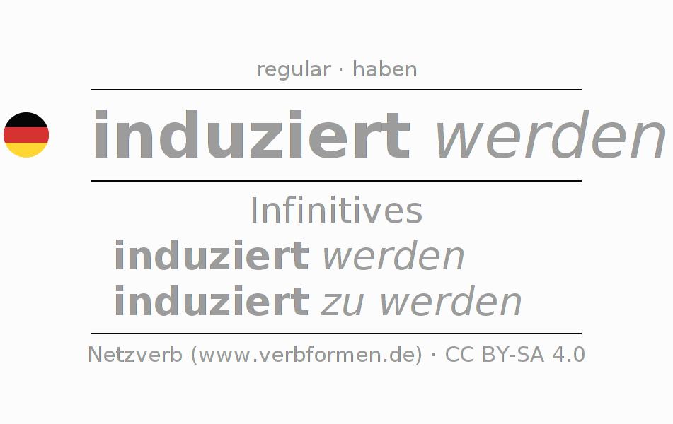 The conjugation of induzieren in Infinitive Present Perfect base form Passive is induziert werden, induziert zu werden.The conjugation corresponds to certain grammatical rules. Likewise the requirements for the conjugation of the simple verb forms of induzieren in Infinitive. Comments ☆