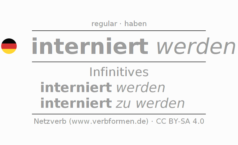The conjugation of internieren in Infinitive Present Perfect base form Passive is interniert werden, interniert zu werden.The conjugation corresponds to certain grammatical rules. Likewise the requirements for the conjugation of the simple verb forms of internieren in Infinitive. Comments ☆