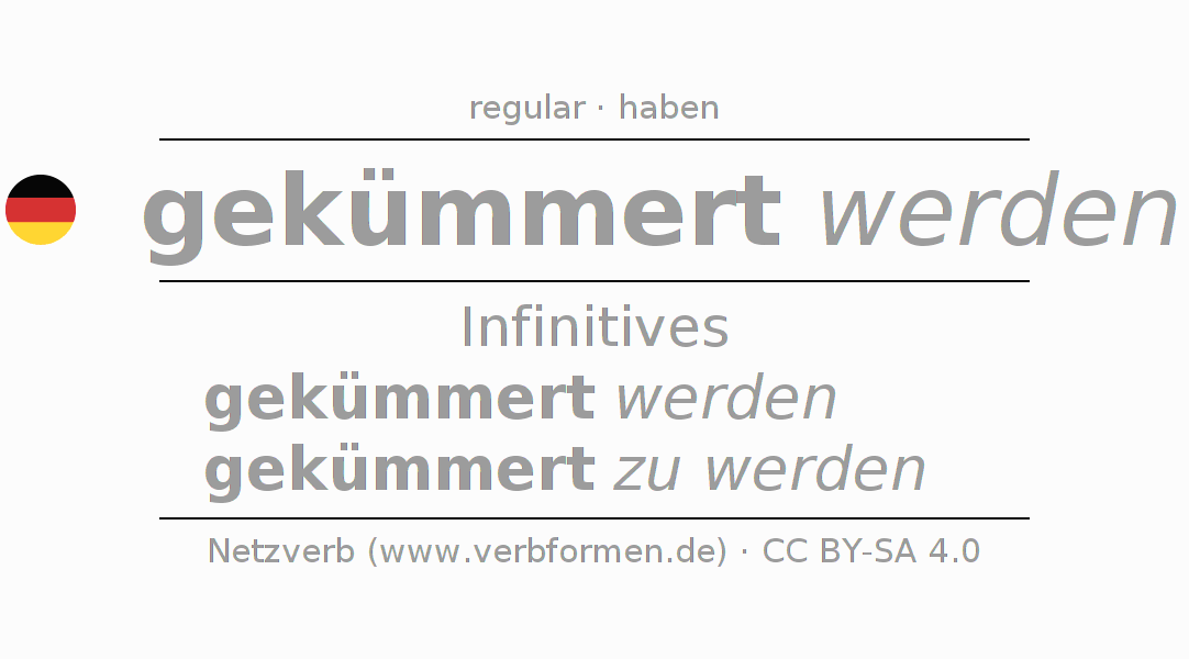 The conjugation of kümmern in Infinitive Present Perfect base form Passive is gekümmert werden, gekümmert zu werden.The conjugation corresponds to certain grammatical rules. Likewise the requirements for the conjugation of the simple verb forms of kümmern in Infinitive. Comments ☆