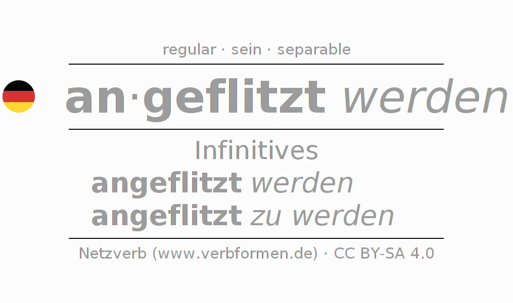 The conjugation of anflitzen in Infinitive Present Perfect base form Passive is angeflitzt werden, angeflitzt zu werden.The conjugation corresponds to certain grammatical rules. Likewise the requirements for the conjugation of the simple verb forms of anflitzen in Infinitive. Comments ☆