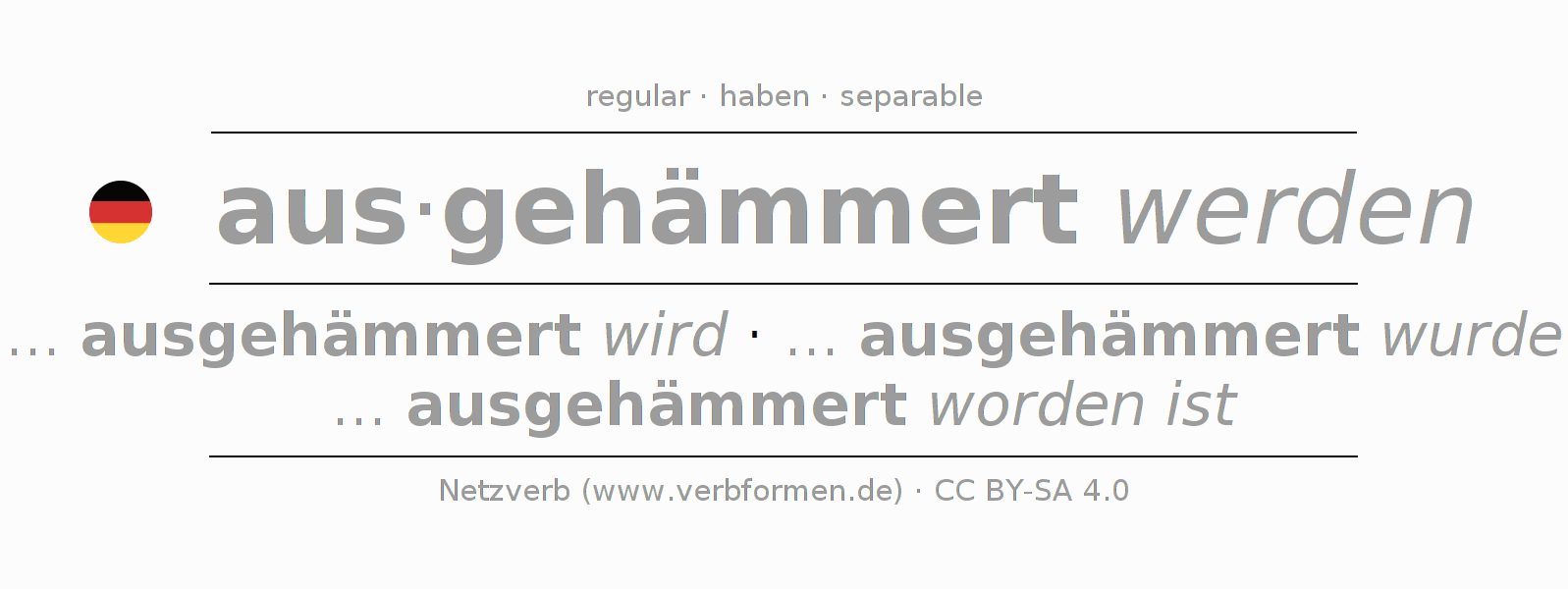 The conjugation of aushämmern in Infinitive Present Perfect base form Passive is ausgehämmert werden, ausgehämmert zu werden.The conjugation corresponds to certain grammatical rules. Likewise the requirements for the conjugation of the simple verb forms of aushämmern in Infinitive. Comments ☆
