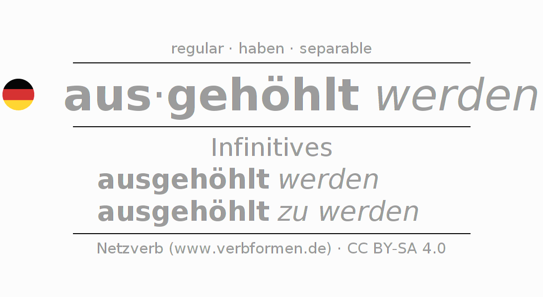 The conjugation of aushöhlen in Infinitive Present Perfect base form Passive is ausgehöhlt werden, ausgehöhlt zu werden.The conjugation corresponds to certain grammatical rules. Likewise the requirements for the conjugation of the simple verb forms of aushöhlen in Infinitive. Comments ☆