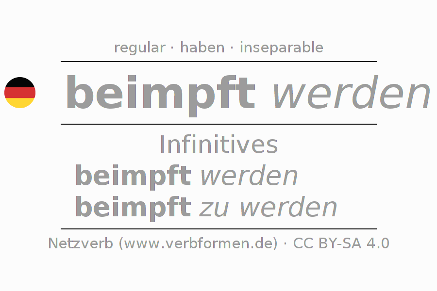 The conjugation of beimpfen in Infinitive Present Perfect base form Passive is beimpft werden, beimpft zu werden.The conjugation corresponds to certain grammatical rules. Likewise the requirements for the conjugation of the simple verb forms of beimpfen in Infinitive. Comments ☆
