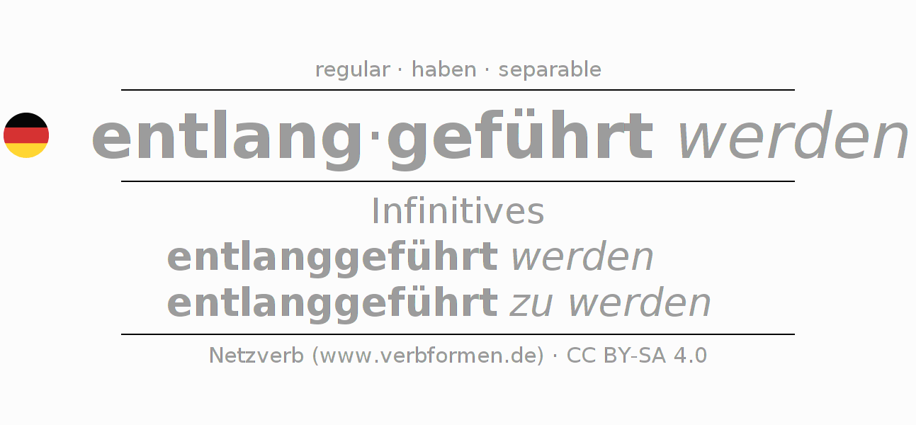 The conjugation of entlangführen in Infinitive Present Perfect base form Passive is entlanggeführt werden, entlanggeführt zu werden.The conjugation corresponds to certain grammatical rules. Likewise the requirements for the conjugation of the simple verb forms of entlangführen in Infinitive. Comments ☆