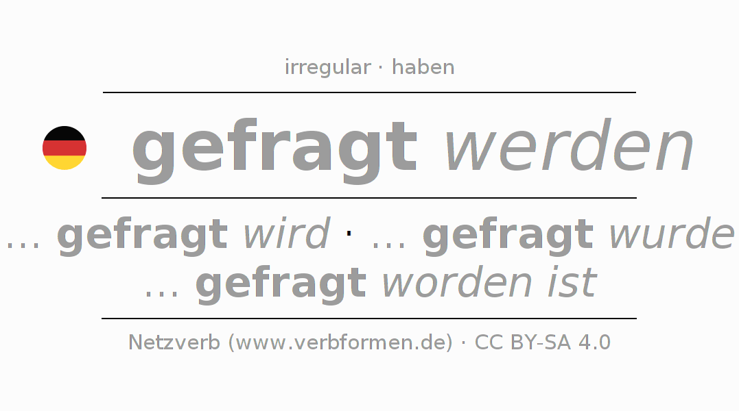 The conjugation of fragen in Infinitive Present Perfect base form Passive is gefragt werden, gefragt zu werden.The conjugation corresponds to certain grammatical rules. Likewise the requirements for the conjugation of the simple verb forms of fragen in Infinitive. Comments ☆