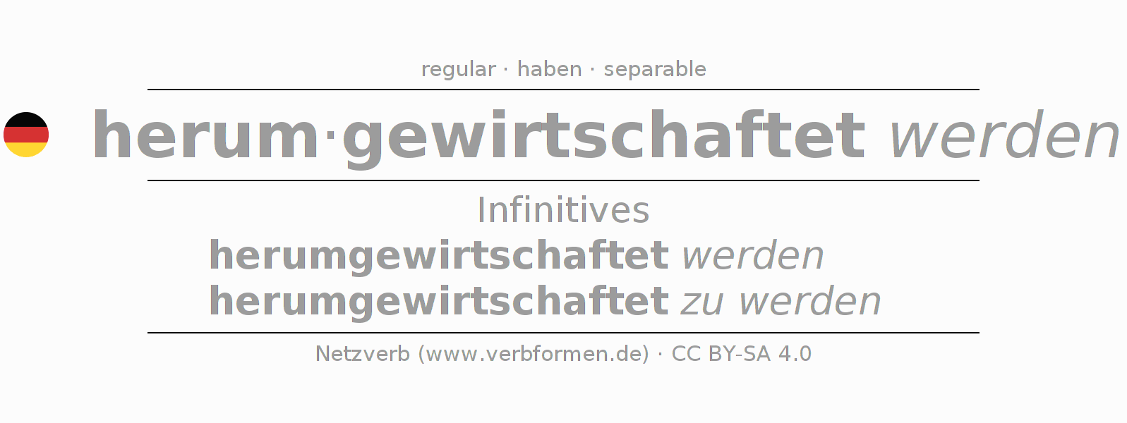 The verb herumwirtschaften fully conjugated in all persons and numbers in the Infinitive Present Perfect