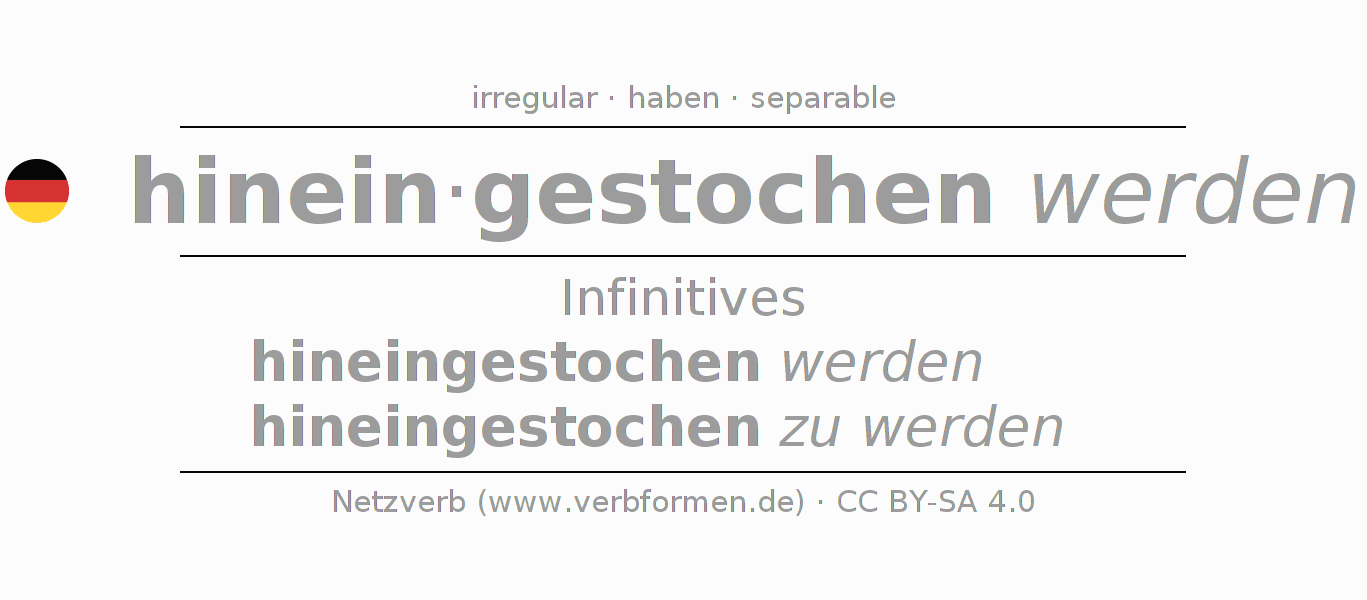 The conjugation of hineinstechen in Infinitive Present Perfect base form Passive is hineingestochen werden, hineingestochen zu werden.The conjugation corresponds to certain grammatical rules. Likewise the requirements for the conjugation of the simple verb forms of hineinstechen in Infinitive. Comments ☆