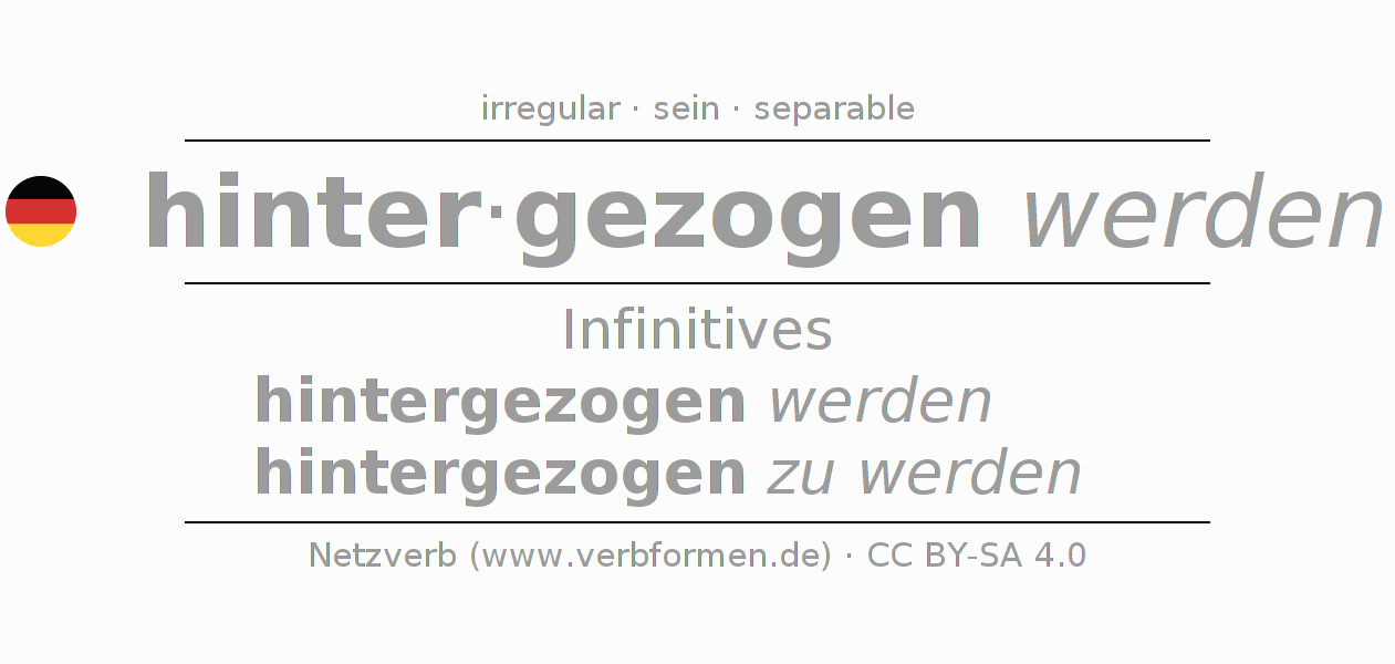 The conjugation of hinterziehen in Infinitive Present Perfect base form Passive is hintergezogen werden, hintergezogen zu werden.The conjugation corresponds to certain grammatical rules. Likewise the requirements for the conjugation of the simple verb forms of hinterziehen in Infinitive. Comments ☆