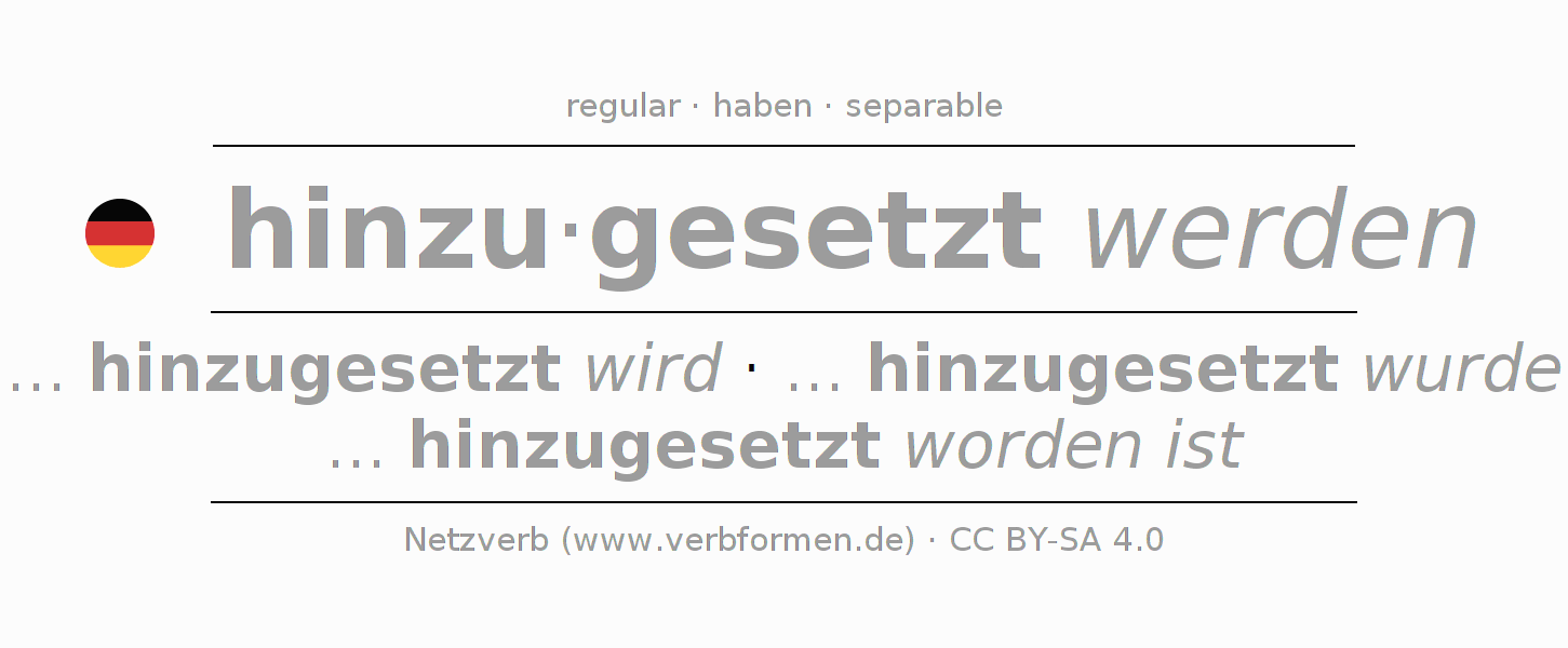 The conjugation of hinzusetzen in Infinitive Present Perfect base form Passive is hinzugesetzt werden, hinzugesetzt zu werden.The conjugation corresponds to certain grammatical rules. Likewise the requirements for the conjugation of the simple verb forms of hinzusetzen in Infinitive. Comments ☆