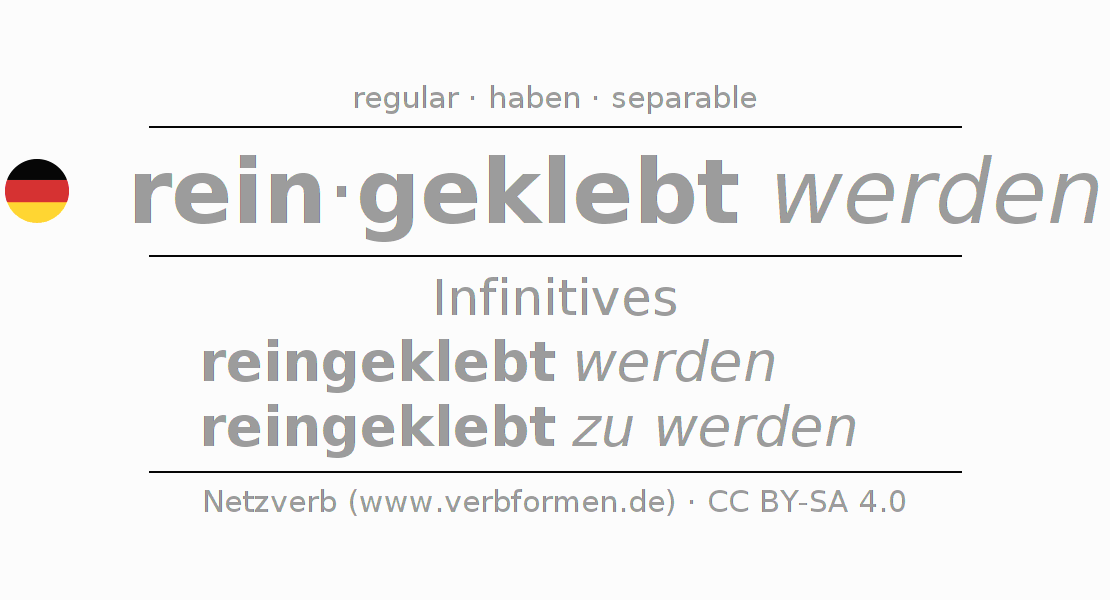 The conjugation of reinkleben in Infinitive Present Perfect base form Passive is reingeklebt werden, reingeklebt zu werden.The conjugation corresponds to certain grammatical rules. Likewise the requirements for the conjugation of the simple verb forms of reinkleben in Infinitive. Comments ☆