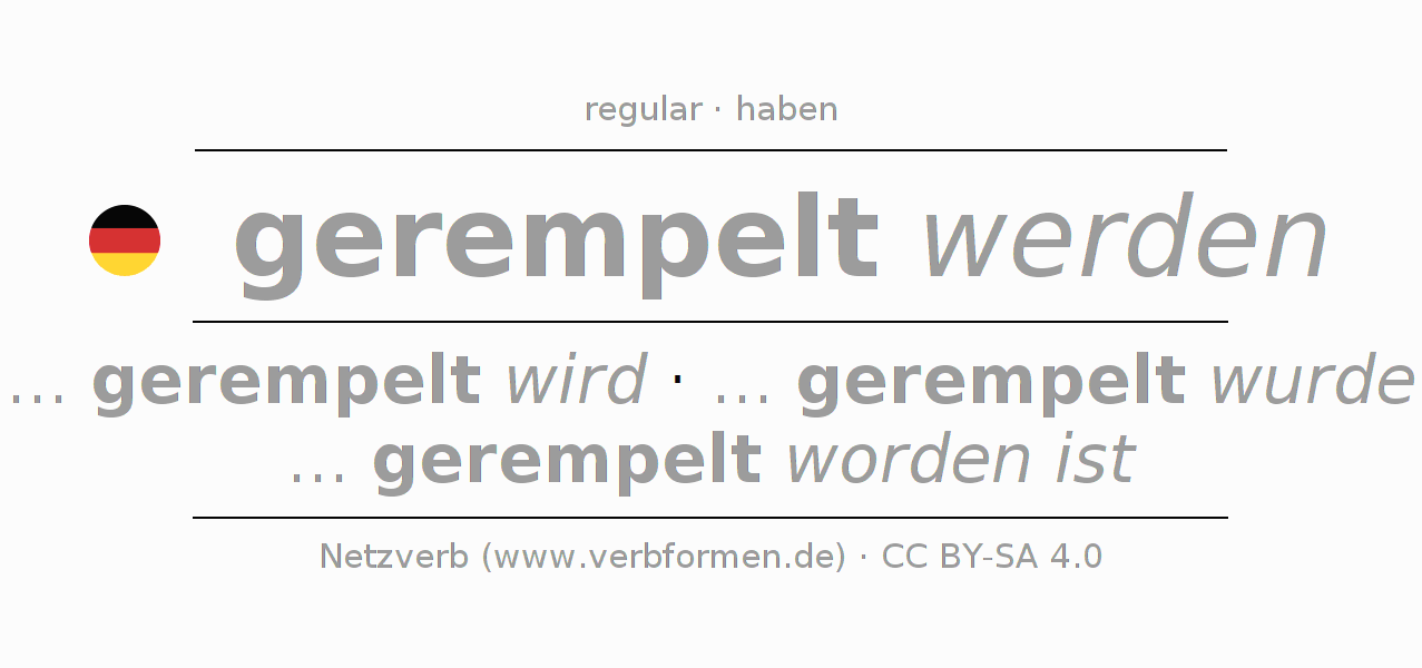 The conjugation of rempeln in Infinitive Present Perfect base form Passive is gerempelt werden, gerempelt zu werden.The conjugation corresponds to certain grammatical rules. Likewise the requirements for the conjugation of the simple verb forms of rempeln in Infinitive. Comments ☆