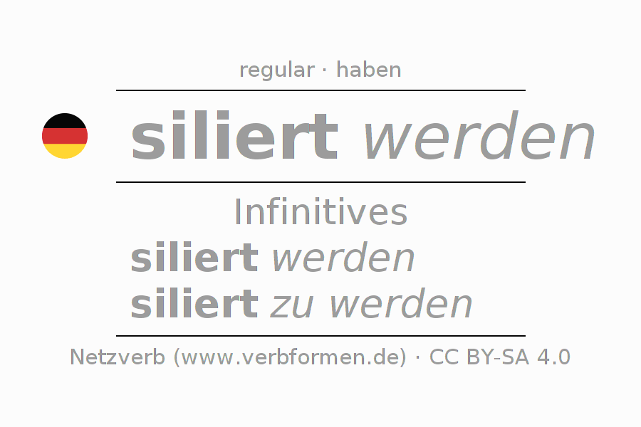 The conjugation of silieren in Infinitive Present Perfect base form Passive is siliert werden, siliert zu werden.The conjugation corresponds to certain grammatical rules. Likewise the requirements for the conjugation of the simple verb forms of silieren in Infinitive. Comments ☆
