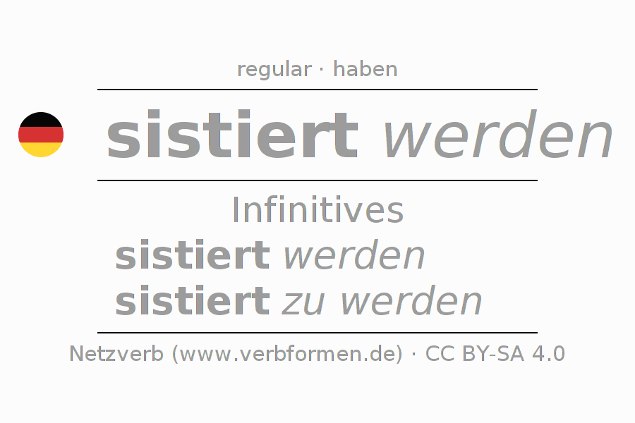 The conjugation of sistieren in Infinitive Present Perfect base form Passive is sistiert werden, sistiert zu werden.The conjugation corresponds to certain grammatical rules. Likewise the requirements for the conjugation of the simple verb forms of sistieren in Infinitive. Comments ☆