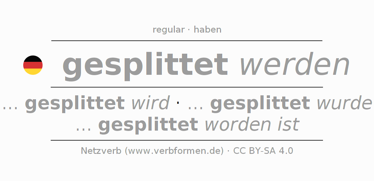 The conjugation of splitten in Infinitive Present Perfect base form Passive is gesplittet werden, gesplittet zu werden.The conjugation corresponds to certain grammatical rules. Likewise the requirements for the conjugation of the simple verb forms of splitten in Infinitive. Comments ☆