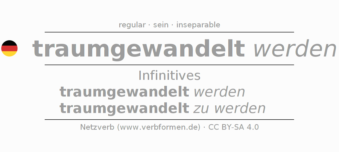 The conjugation of traumwandeln in Infinitive Present Perfect base form Passive is traumgewandelt werden, traumgewandelt zu werden.The conjugation corresponds to certain grammatical rules. Likewise the requirements for the conjugation of the simple verb forms of traumwandeln in Infinitive. Comments ☆