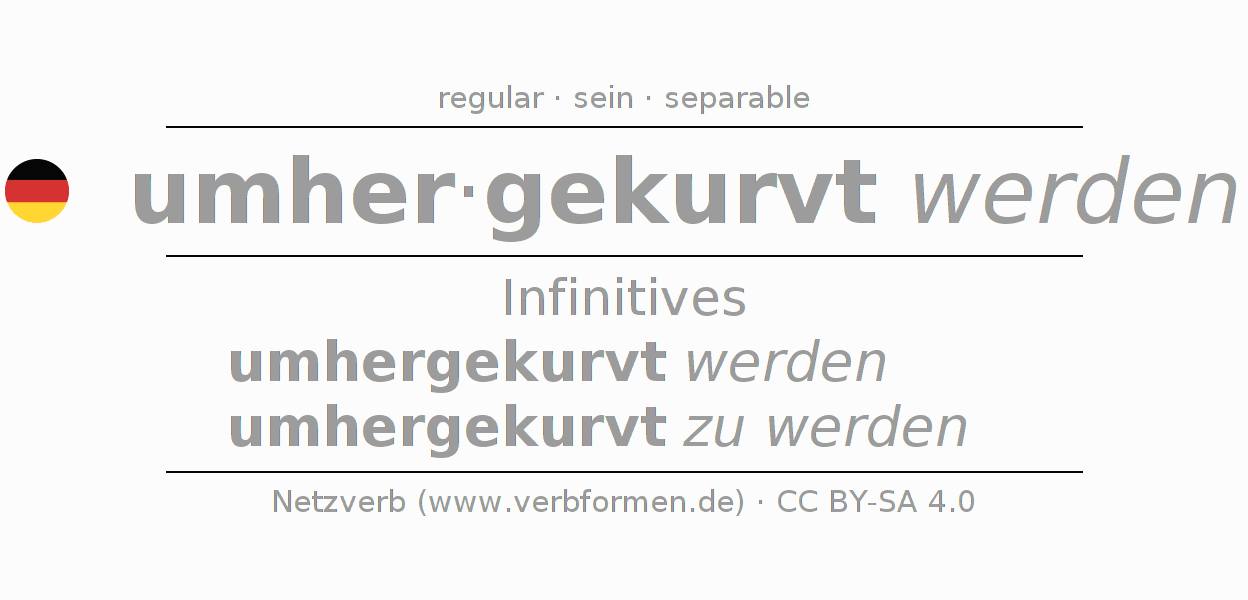 The conjugation of umherkurven in Infinitive Present Perfect base form Passive is umhergekurvt werden, umhergekurvt zu werden.The conjugation corresponds to certain grammatical rules. Likewise the requirements for the conjugation of the simple verb forms of umherkurven in Infinitive. Comments ☆