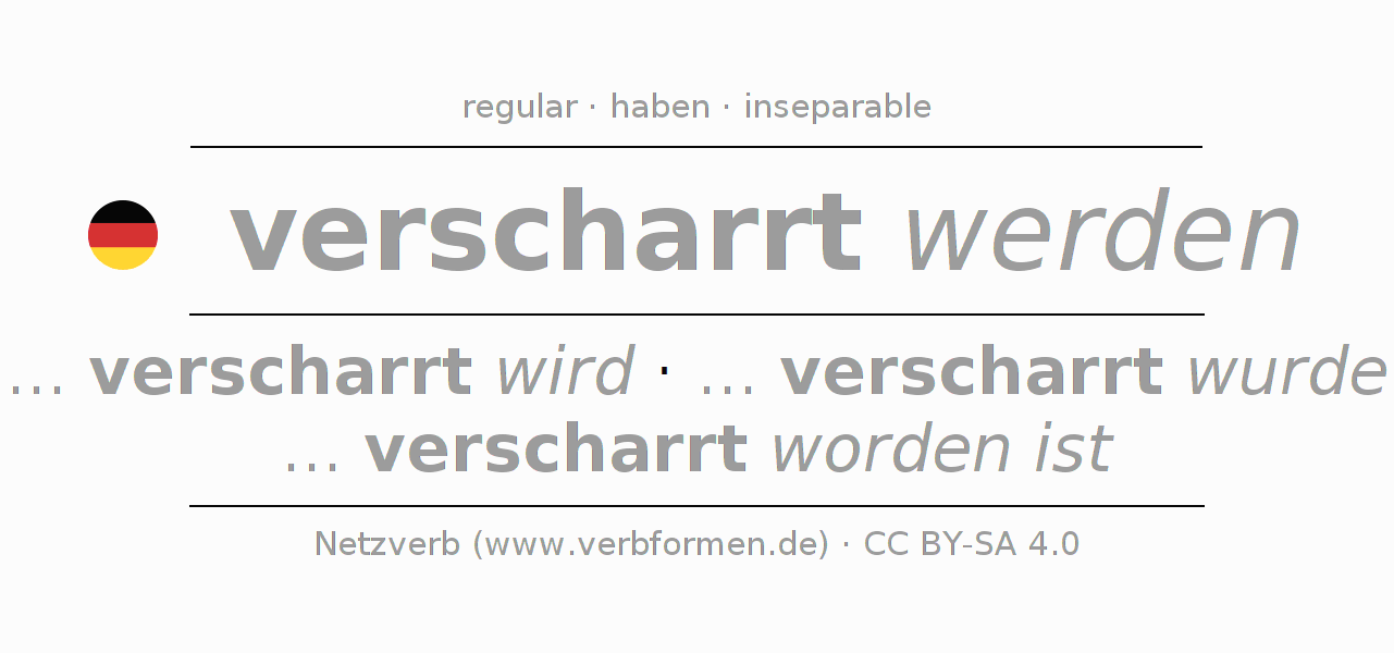 The conjugation of verscharren in Infinitive Present Perfect base form Passive is verscharrt werden, verscharrt zu werden.The conjugation corresponds to certain grammatical rules. Likewise the requirements for the conjugation of the simple verb forms of verscharren in Infinitive. Comments ☆