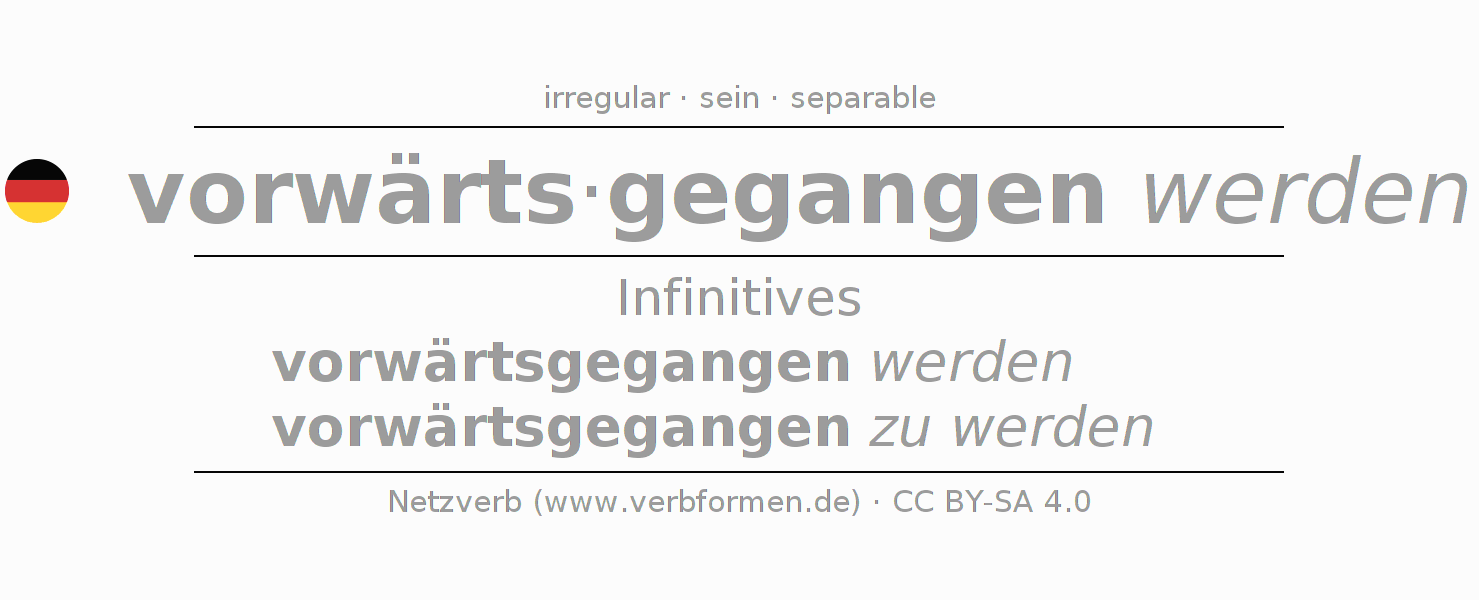 The verb vorwärtsgehen fully conjugated in all persons and numbers in the Infinitive Present Perfect
