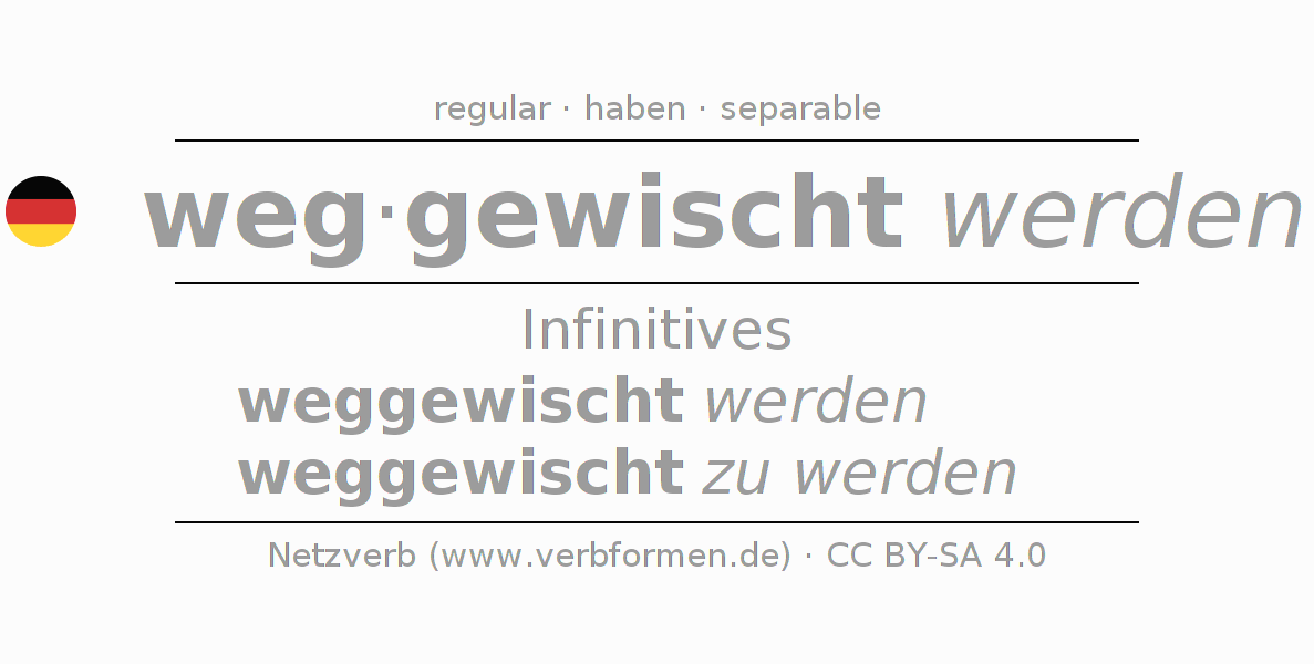 The conjugation of wegwischen in Infinitive Present Perfect base form Passive is weggewischt werden, weggewischt zu werden.The conjugation corresponds to certain grammatical rules. Likewise the requirements for the conjugation of the simple verb forms of wegwischen in Infinitive. Comments ☆