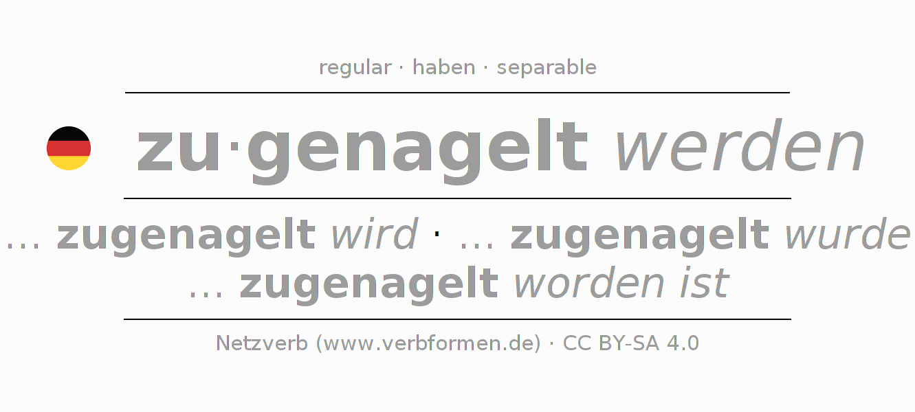 The conjugation of zunageln in Infinitive Present Perfect base form Passive is zugenagelt werden, zugenagelt zu werden.The conjugation corresponds to certain grammatical rules. Likewise the requirements for the conjugation of the simple verb forms of zunageln in Infinitive. Comments ☆