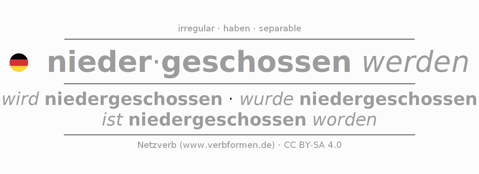 The conjugation of niederschießen in Infinitive Present Perfect base form Passive is niedergeschossen werden, niedergeschossen zu werden.The conjugation corresponds to certain grammatical rules. Likewise the requirements for the conjugation of the simple verb forms of niederschießen in Infinitive. Comments ☆