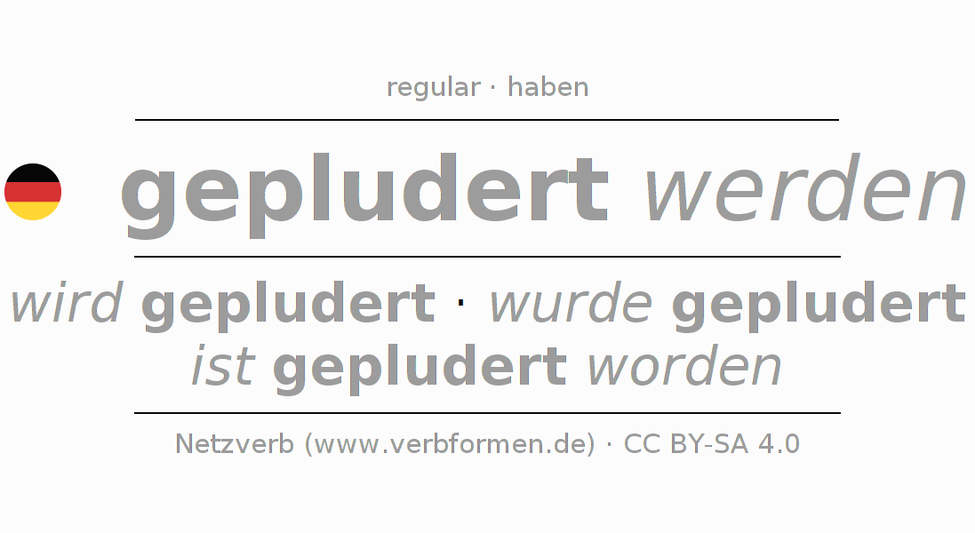 The conjugation of pludern in Infinitive Present Perfect base form Passive is gepludert werden, gepludert zu werden.The conjugation corresponds to certain grammatical rules. Likewise the requirements for the conjugation of the simple verb forms of pludern in Infinitive. Comments ☆