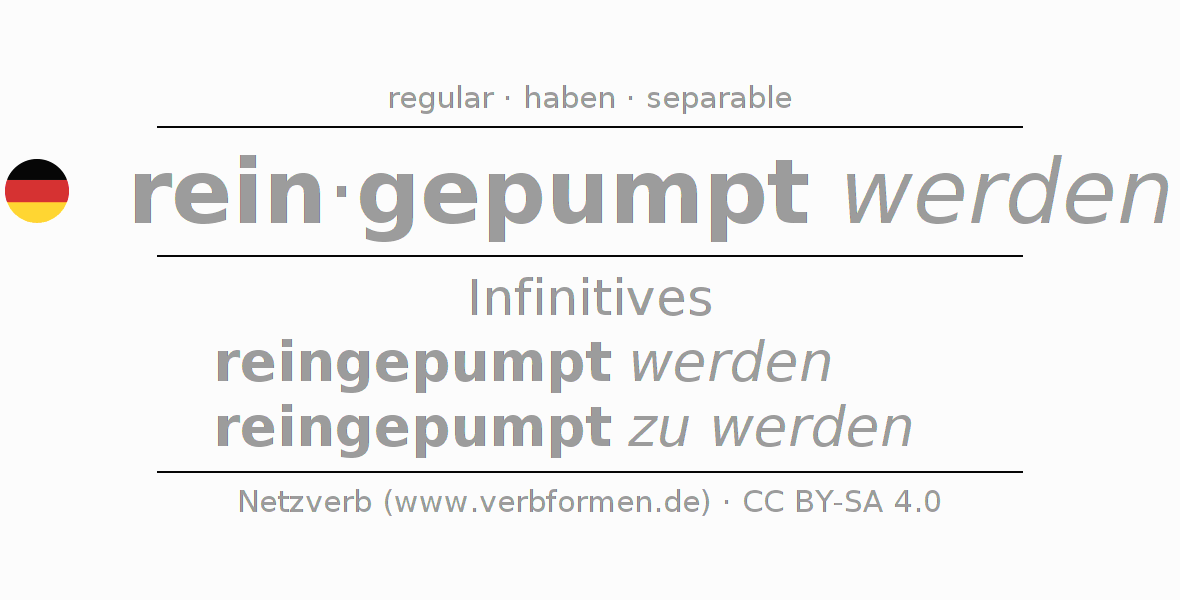 The conjugation of reinpumpen in Infinitive Present Perfect base form Passive is reingepumpt werden, reingepumpt zu werden.The conjugation corresponds to certain grammatical rules. Likewise the requirements for the conjugation of the simple verb forms of reinpumpen in Infinitive. Comments ☆