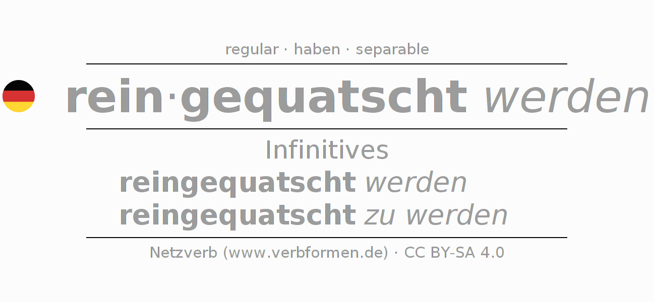 The conjugation of reinquatschen in Infinitive Present Perfect base form Passive is reingequatscht werden, reingequatscht zu werden.The conjugation corresponds to certain grammatical rules. Likewise the requirements for the conjugation of the simple verb forms of reinquatschen in Infinitive. Comments ☆