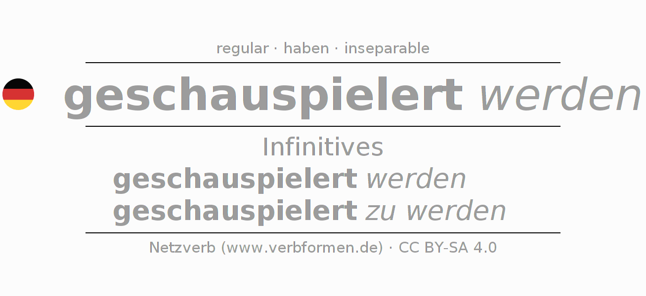 The conjugation of schauspielern in Infinitive Present Perfect base form Passive is geschauspielert werden, geschauspielert zu werden.The conjugation corresponds to certain grammatical rules. Likewise the requirements for the conjugation of the simple verb forms of schauspielern in Infinitive. Comments ☆