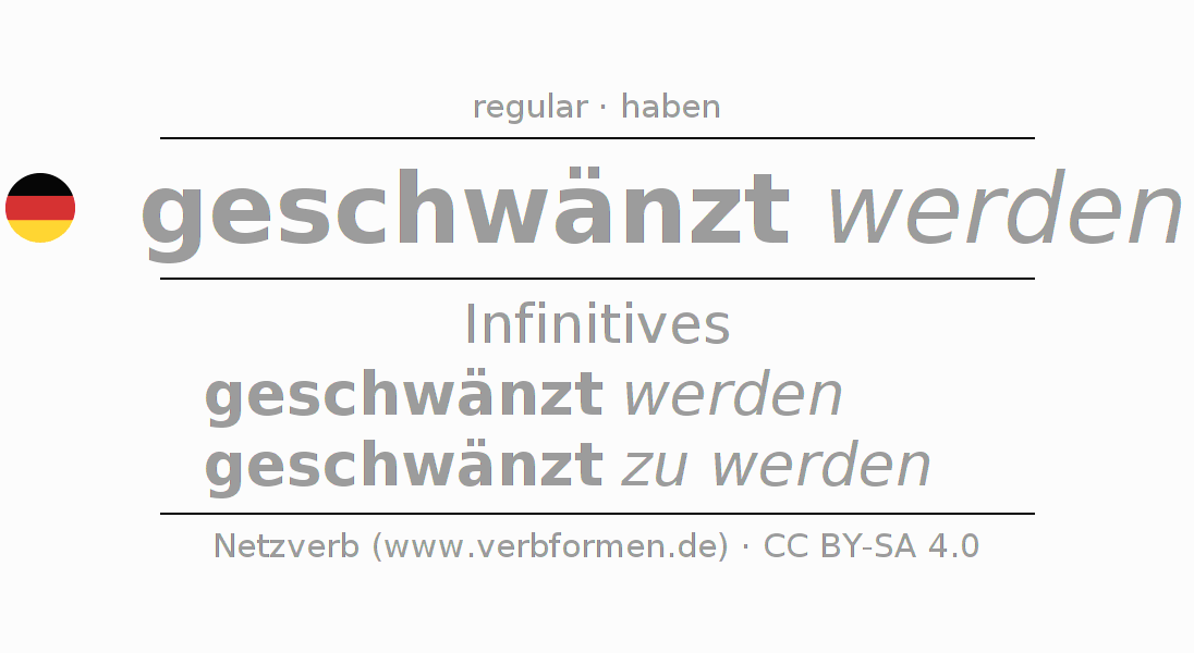 The conjugation of schwänzen in Infinitive Present Perfect base form Passive is geschwänzt werden, geschwänzt zu werden.The conjugation corresponds to certain grammatical rules. Likewise the requirements for the conjugation of the simple verb forms of schwänzen in Infinitive. Comments ☆