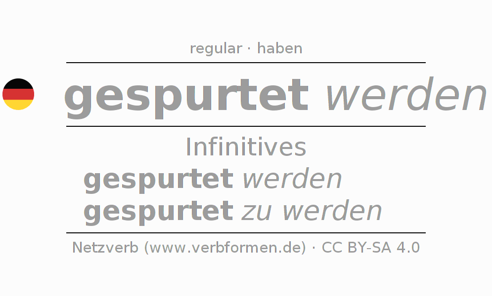 The conjugation of spurten in Infinitive Present Perfect base form Passive is gespurtet werden, gespurtet zu werden.The conjugation corresponds to certain grammatical rules. Likewise the requirements for the conjugation of the simple verb forms of spurten in Infinitive. Comments ☆