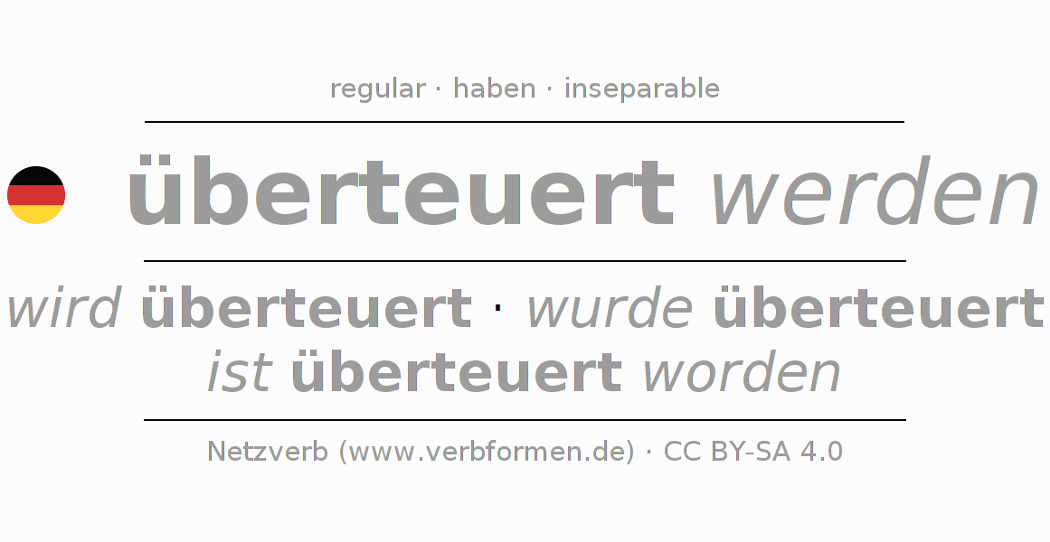 The conjugation of überteuern in Infinitive Present Perfect base form Passive is überteuert werden, überteuert zu werden.The conjugation corresponds to certain grammatical rules. Likewise the requirements for the conjugation of the simple verb forms of überteuern in Infinitive. Comments ☆