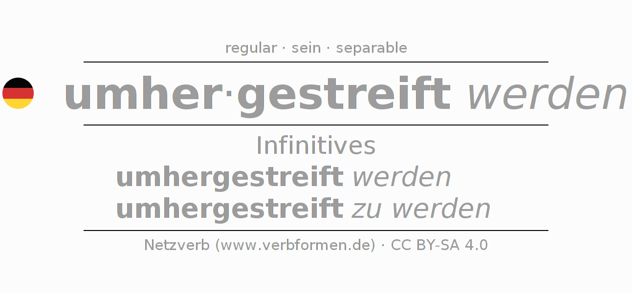 The conjugation of umherstreifen in Infinitive Present Perfect base form Passive is umhergestreift werden, umhergestreift zu werden.The conjugation corresponds to certain grammatical rules. Likewise the requirements for the conjugation of the simple verb forms of umherstreifen in Infinitive. Comments ☆