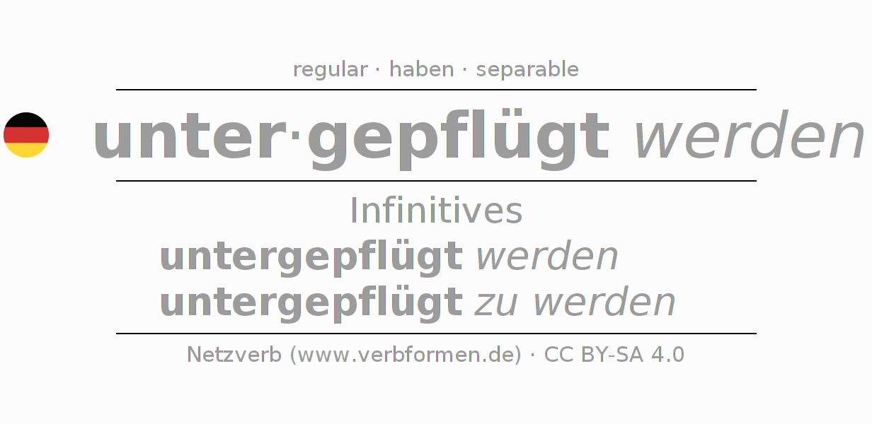 The conjugation of unterpflügen in Infinitive Present Perfect base form Passive is untergepflügt werden, untergepflügt zu werden.The conjugation corresponds to certain grammatical rules. Likewise the requirements for the conjugation of the simple verb forms of unterpflügen in Infinitive. Comments ☆
